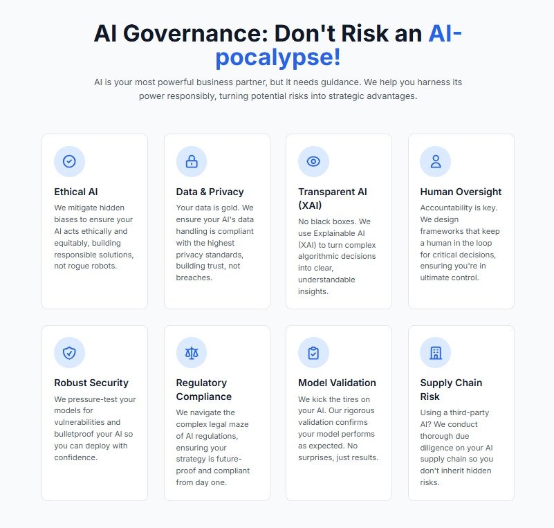 Welcome to the future, where Artificial Intelligence is your most powerful business partner. But like any powerful partner, it needs guidance and a good set of rules. That's where AI Governance and Due Diligence come in. We help you harness the power of AI without the "I-told-you-so" moments. Think of us as the expert drivers for your high-performance AI engine.